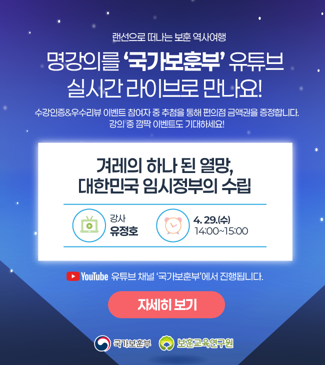 보훈교육연구원에서는 보훈을 일상에서 자연스럽게 접하고 공감하는 사회문화를 조성하기 위하여국가보훈부 유튜브 채널을 통해 을 운영합니다.김정현 강사님과 함께할 예정이니, 많은 관심과 참여 부탁드립니다.○ 주제 : 4·19혁명, 민주주의의 불씨가 되다○ 강사 : 김정현 강사○ 일시 : 2026. 3. 25.(수) 14:00~15:00○ 참여방법 : 온라인 / 국가보훈부 유튜브- 실시간 참여 링크 : https://www.youtube.com/watch?v=nK3DS7lD6Rk