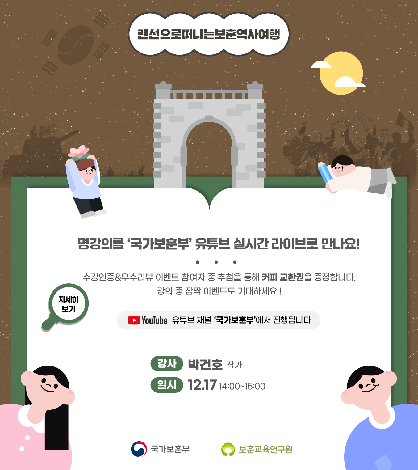 보훈교육연구원에서는 보훈을 일상에서 자연스럽게 접하고 공감하는 사회문화를 조성하기 위하여 국가보훈부 유튜브 채널을 통해 을 운영합니다.박건호 작가님과 함께할 예정이니, 많은 관심과 참여 부탁드립니다.○ 주제 : 한국근현대사와 5번의 독립○ 강사 : 박건호 작가○ 일시 : 2025. 12. 17.(수) 14:00~15:00○ 참여방법 : 온라인 / 국가보훈부 유튜브 - 실시간 참여 링크 : https://www.youtube.com/live/95MUkfaVxaE?si=yfVe-gSKMqjY56KS