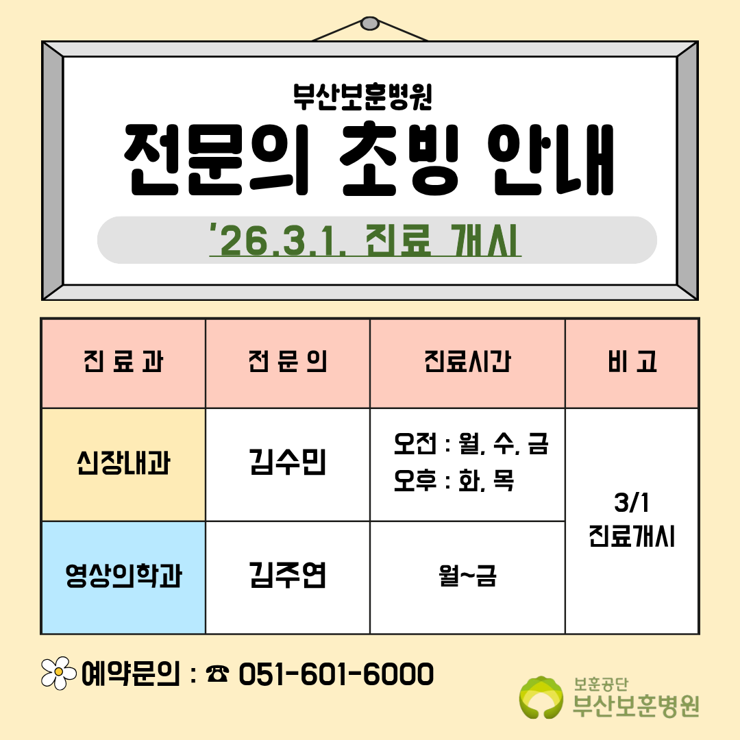 [부산보훈병원] 전문의(6개과) 및 응급실 전담의 긴급공개채용 최종합격자 발표 2025-12-04채용정보