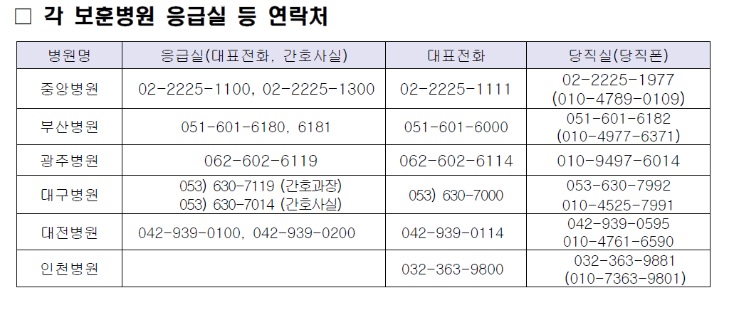 - 연휴기간 중 보훈병원 응급실 전화번호와 지역별 위탁병원 응급실 진료일정을 붙임과 같이 안내하오니 참고하시고, 궁금하신 사항은 해당 보훈병원