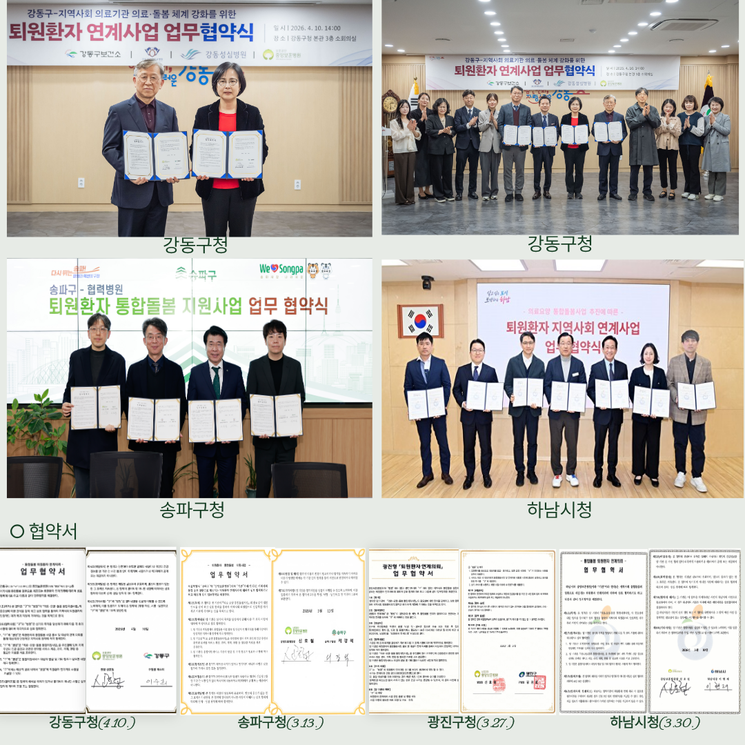 협약은 ▲송파구청(3월 13일)을 시작으로 ▲광진구청(3월 27일) ▲하남시청(3월 30일) ▲강동구청(4월 10일)과 협약을 맺고, 병원과 지역사회를 잇는 견고한 돌봄 생태계 구축에 뜻을 모았다.