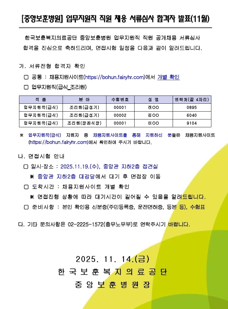 결과확인: 채용지원사이트( http://bohun.fairyhr.com )에서 개별 확인(16시~, 크롬 또는 엣지 접속)
