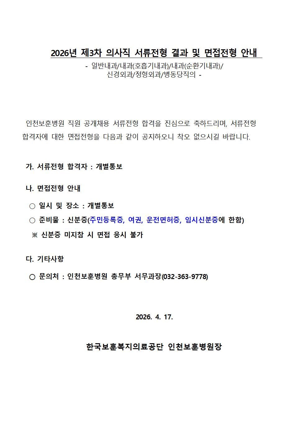 [인천보훈병원] 2026년 제3차 의사직(일반내과,내과(호흡기,순환기),신경외과,정형외과,병동당직의) 서류전형 결과 및 면접전형 안내