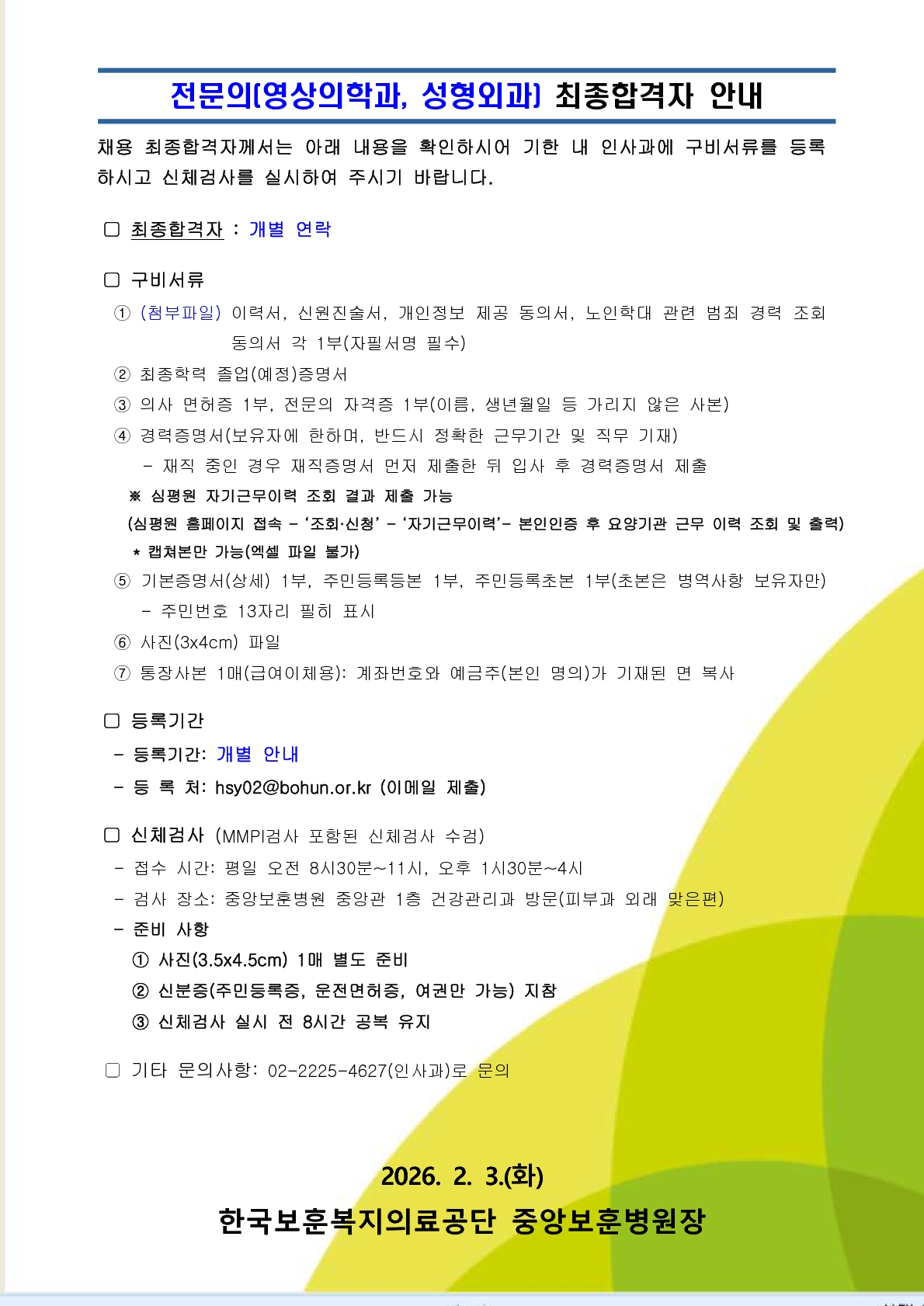 [중앙보훈병원] 전문의(영상의학과·성형외과) 채용 최종합격자 발표