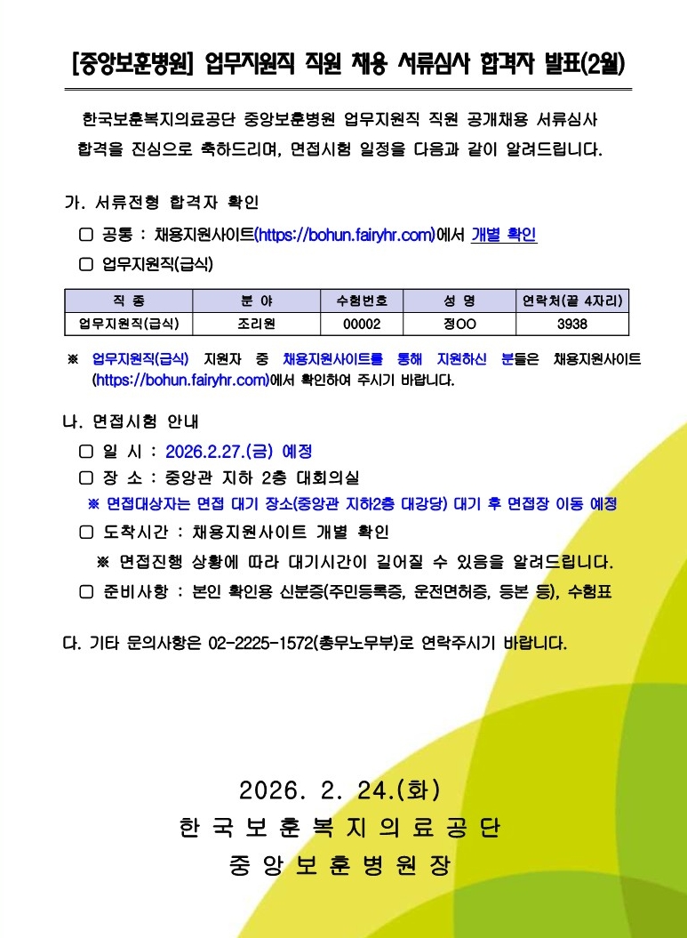 [중앙보훈병원] 업무지원직 직원 공개채용 서류합격자 발표(2월)