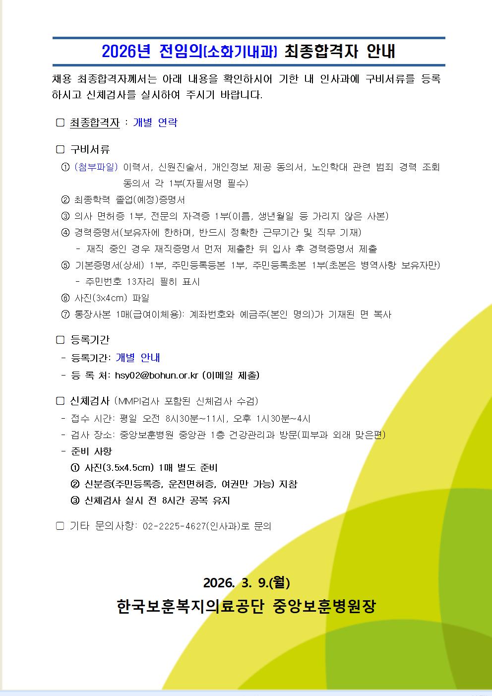 [중앙보훈병원] 2026년 전임의(소화기내과) 채용 최종합격자 발표