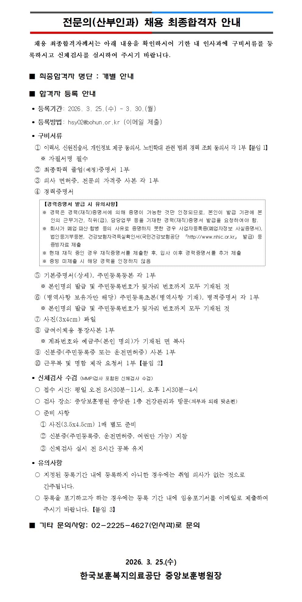 [중앙보훈병원] 전문의(산부인과) 채용 최종합격자 안내