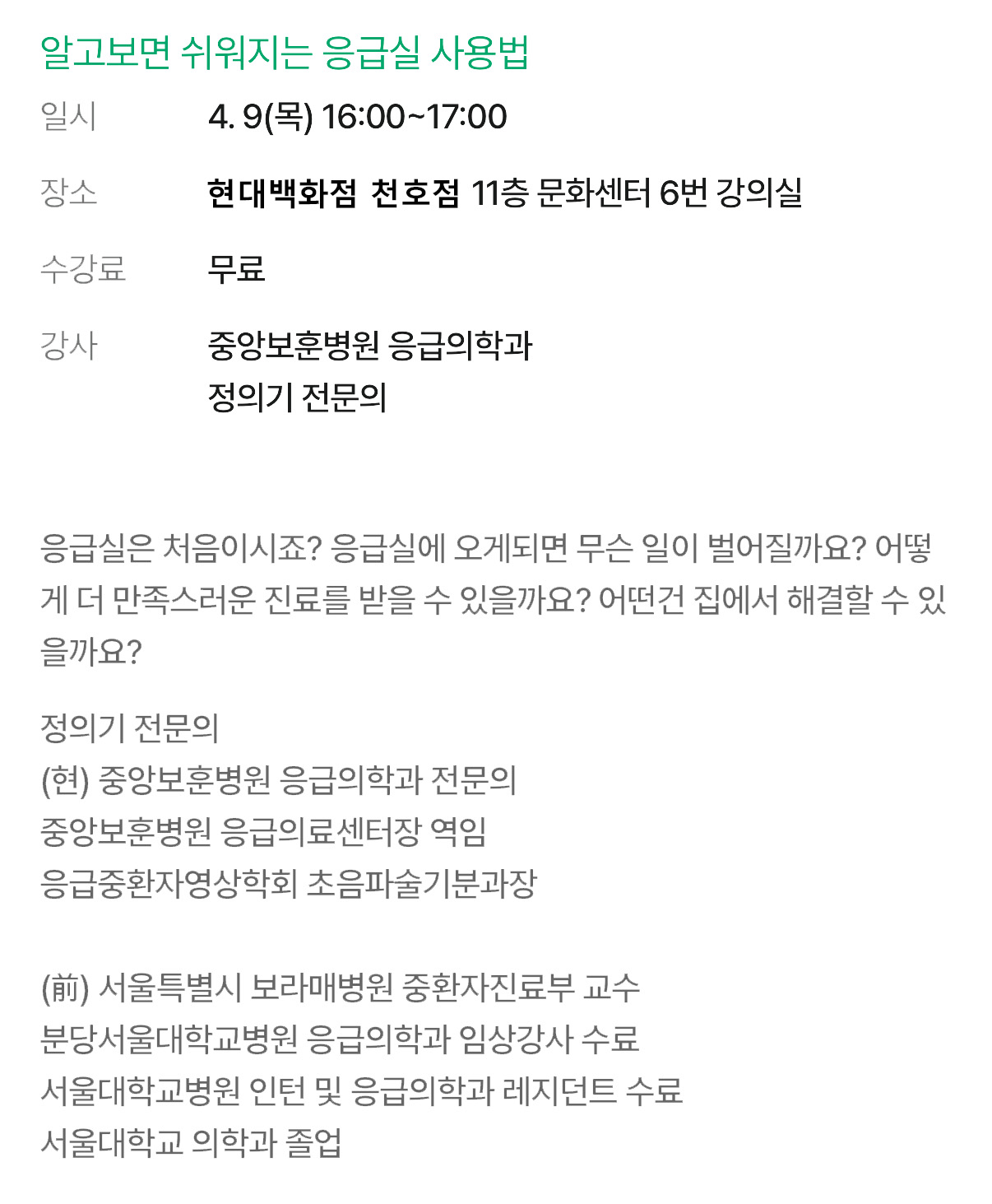 [무료 건강강좌] 알고보면 쉬워지는 응급실 사용법