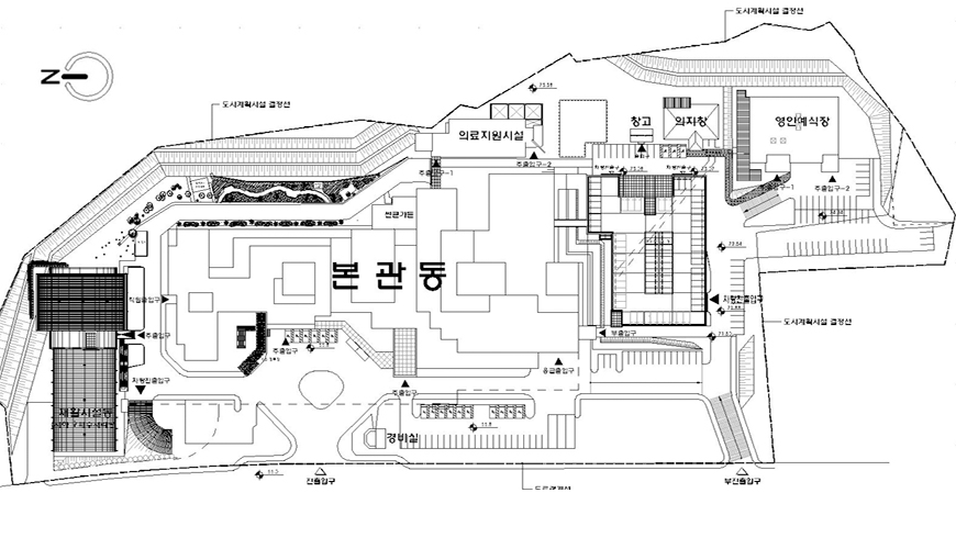 | 구분 | 본관 | 재활시설동 | 의료지원시설 | 장례식장 | 보장구센터 | 경비실 | 창고 | 옥외케노피 등 기타 | 계 |