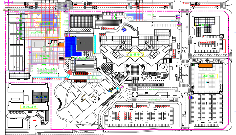 | 구분 | 본관 | 재활체육관 | 장례식장 | 전문재활센터 | 요양병원 | 양궁장 | 쓰레기장 | 옥외창고 | 계 |