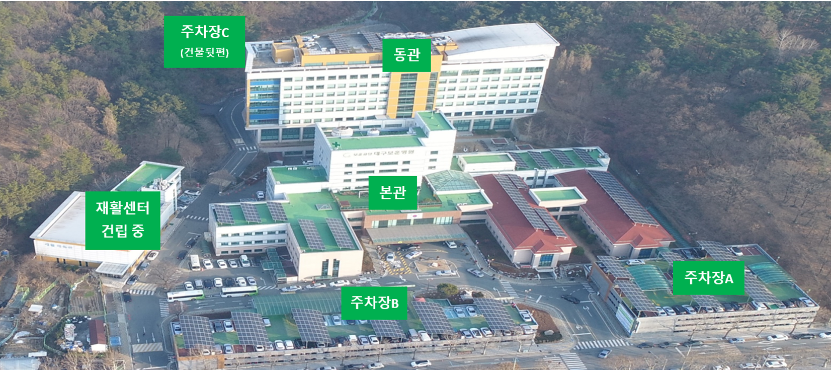 | 건물규모 | 지하1층, 지상7층 | 지하2층, 지상7층 | 재활센터 건립 중 | 지상1층 | 지상1층 | - | |