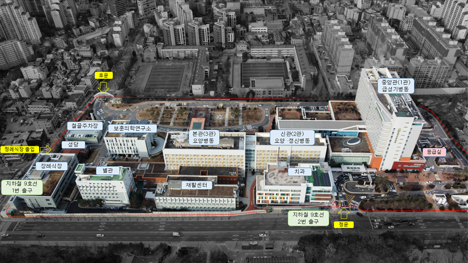 | 구분 | 중앙관 | 제3관 | 제2관 | 종합재활센터 | 별관 | 치과병원 | 성당 | 장례식장 | 보훈의학연구소 | 수위실 | 계 |